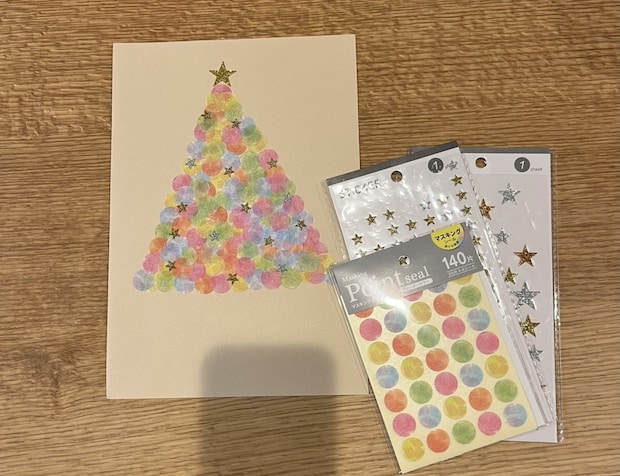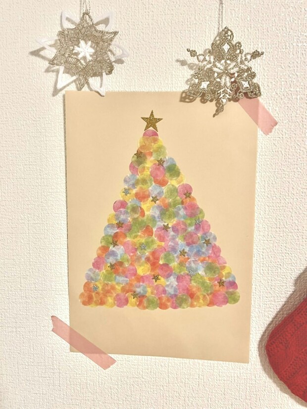 スタンプを押して作られたのかな?と思いましたが、全てシール!色の重なりもふんわりとしていて幻想的。まるでツリーがライトアップされているように見えます。