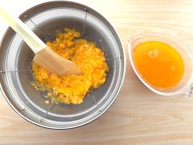 みかんは洗って皮を剥き、中の薄皮ごとミキサーなどにかけて粉砕したら、茶こしやざるを使って漉して「みかん果汁」を240ml搾り取ります。