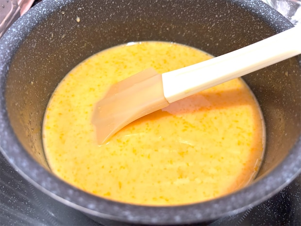粉っぽさがなくなるくらいまで混ぜたら、火にかけて弱火(IHクッキングヒーターだと140℃くらい)で温めていきます。