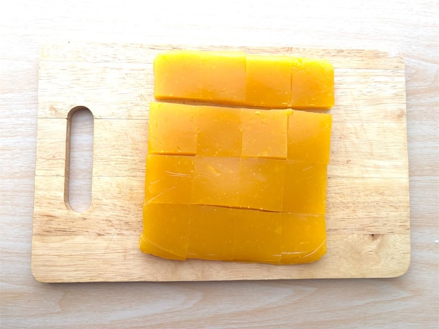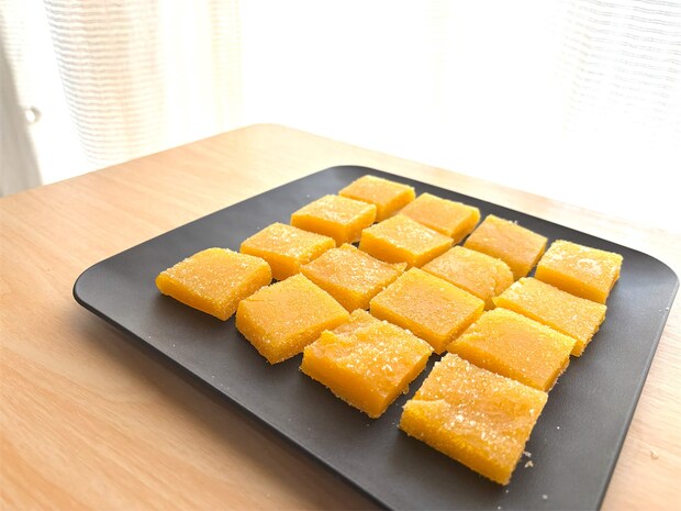 冷やし固めたら、適度な大きさに切り、周りに砂糖(分量外・適量)をまぶしたら完成です。