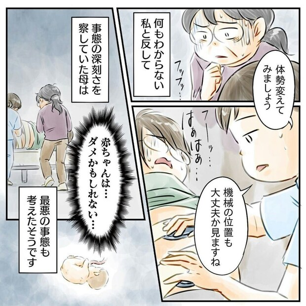 異変にいち早く気づいた星田つまみ(@hoshi.da)さんのお母さん。元看護師だからこそ、この時最悪のケースも考えていたのだそう…。分娩(ぶんべん)室へ移動することになりますが…?