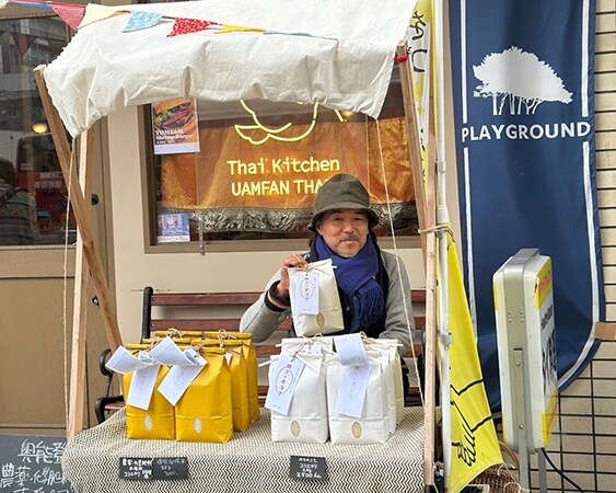 同日15:00~「あえのこと」を執り行う2人目の継承者は、震災直後から珠洲にボランティアで入り、現在、金沢と2拠点生活を行う岡嶋健市さんだ。週の半分は金沢でデザイナーとして働き、珠洲ではボランティア活動、ボランティアキャンプ運営をしながら有機米の栽培・販売を行っている。