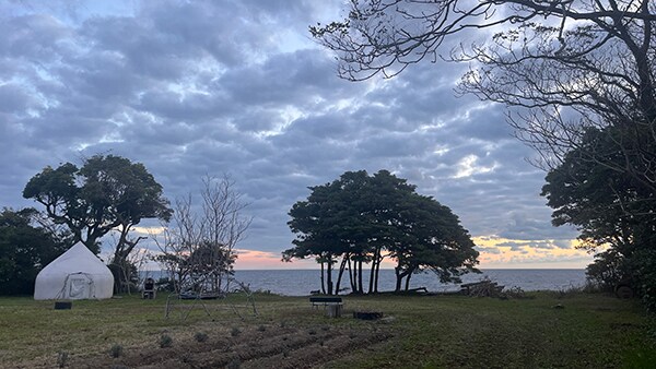 岡嶋さんが「あえのこと」を執り行う場所は、ボランティアキャンプ施設の一角に建てられたインスタントハウス。名古屋工業大学大学院の北川啓介教授の研究をもとに、LIFULLと同大学院による産学連携協定にて開発した新しい構築物だ。珠洲の海のすぐ側にある。