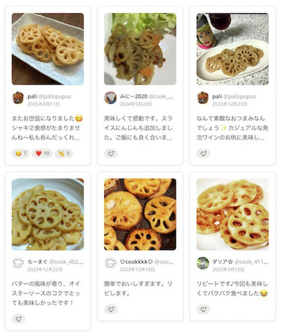 つくれぽ(つくりましたフォトレポートのこと)にも「ガリバタ味、最高です」「シャキシャキれんこんとガリバタがおいしい」「おいしくて何回も作っている」「お酒のおつまみにもなる」などの声が届いています。