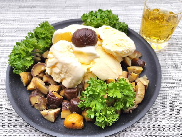 バニラアイスはブランデーやウイスキーと相性が良いことで知られていますが、今回はそこに”栗”が加わります。ナッツ類は洋酒との相性が良く「乾きもの」として出されることが多いですが、栗はしっとりとしているため、バニラアイスとも食感がぶつかりません。さらに焼き栗特有の香ばしさがウイスキーのスモーキーな香りと絶妙にマッチし、やさしい味わいに仕上がっていますね。