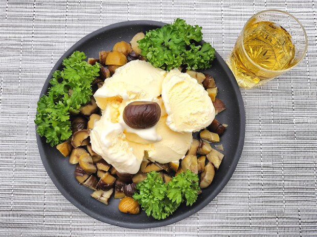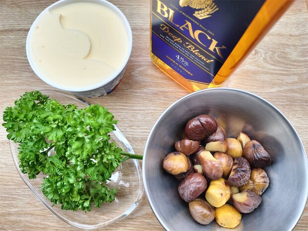 1. むき栗をトッピング用に一粒だけ残して残りを砕いて器に盛りつけ、パセリとバニラアイスを乗せます。むき栗をトッピングして、ブラックニッカ ディープブレンドを添えて出来上がりです。