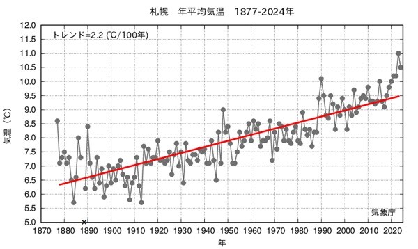 また、札幌管区気象台の調査によると、札幌管内の年平均気温はさまざまな変動を繰り返しながらも上昇傾向が明らかで、100年間で2.2℃以上高くなっている(*2)。