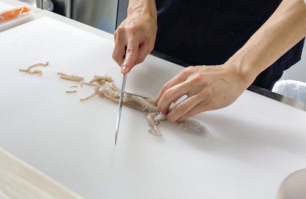 そして、活きのいいタコはすぐにスタッフによって目の前で調理。一匹丸ごと捌き、食べられない部分のみをカットして提供される。