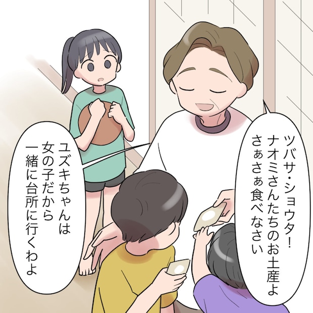 その後、「ツバサ、ショウタ!ナオミさんたちのお土産よ。さぁさぁ食べなさい。」そう言っていとこたちにお菓子を渡し、「ユズキちゃんは女の子だから、一緒に台所に行くわよ」と言う義母に、