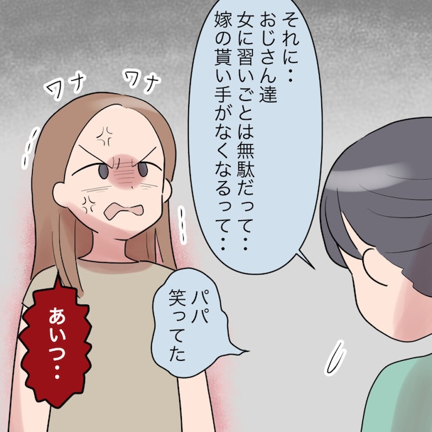4年ぶりに夫ミノルさんの実家に帰省することになったナオミさんは、男尊女卑の考えが色濃く残る義実家が本当に憂鬱でした。義実家に到着すると、さっそく「一杯やるぞ」とミノルさんに声をかける親戚たちにうんざり。「尻に敷かれて」嫁をしつけろ」と言われても「あはは」と笑っているだけのミノルさんを見て、ナオミさんはうんざり。その後、義母に手伝うよう言われたナオミさんは、娘のユズキちゃんまで手伝うよう言われて反論。すると、「大学出てる女なんて男の言うこと聞かない」と義父と親戚に言われ、ミノルさんも手伝うように言い出してイライラ。その後も、「女に習い事や塾は通わせなくていい」だの「ミノルの嫁みたいな生意気な女になっても困る」だのと悪口で盛り上がる親戚たちのなかで、ユズキちゃんは肩を震わせて涙を流しました。