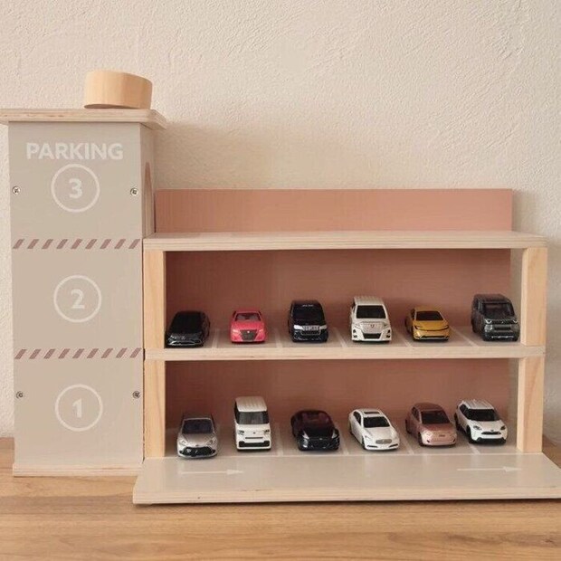 遊びながらお片付けもできる♪「ミニカー用エレベーター」&「ミニカー収納棚」