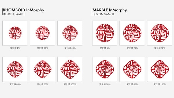 開発者は「印鑑の輪郭を固定するのではなく、変化のプロセスそのものをデザインとして楽しめること。それが印モルフィーの魅力です。今回の新作フレームでは、ロンボイドに調和のとれた幾何学的変化を、マーブルにマーブリング技法をモチーフにした流動美を取り入れました。印影に変化のプロセスを組み込むことで、これまでにないデザインへと進化しました」と述べている。