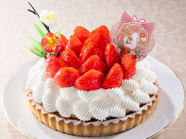 アーモンド生地のタルト台にストロベリークリーム、スポンジ、シャンティクリームを重ね、「あまおう苺」を飾ったタルト。