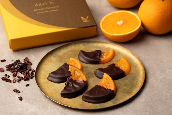 「オランジェット -清見オレンジ-」は、果汁たっぷりの清見オレンジを独自製法で約1ヶ月かけて蜜漬けし、dari Kのダークチョコレートでコーティングしたもの。愛媛県産の清見オレンジは、みかん由来のまろやかな甘さと、オレンジの爽やかな香り、とろけるような果肉が特長だ。