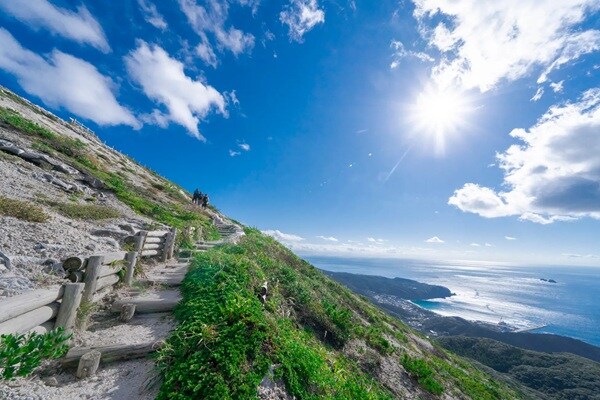 体を動かしたい人には、天上山トレッキングもおすすめ!登山道の途中から青く澄んだ神津ブルーの海を一望できる。