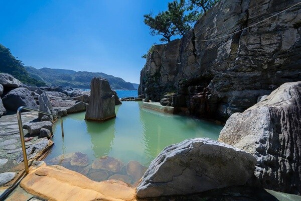 3つ目は、温泉。海を望む露天風呂からは、沈みゆく夕日や満天の星を楽しむこともできる。