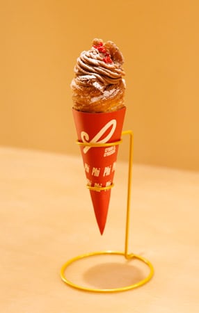 Cream&Croissant「TROIS(トロワ)」は、クロワッサン生地を使用したコルネ型のリッチでスペシャルなシリーズ。イートインはもちろん、テイクアウトして「食べ歩きできるご褒美スイーツ」として気軽に味わうことができる。「フランス産マロン w/ラズベリージャム」950円は、濃厚なフランス産マロンやリッチなカスタード、ラズベリージャムの甘酸っぱい酸味が合わさり、食べ進めるごとに変化する味を楽しめる。