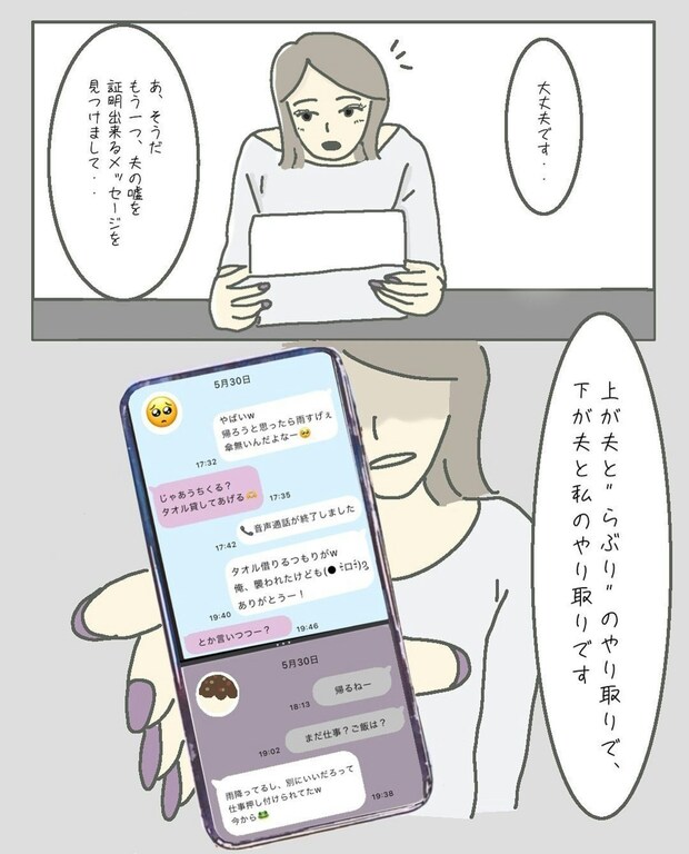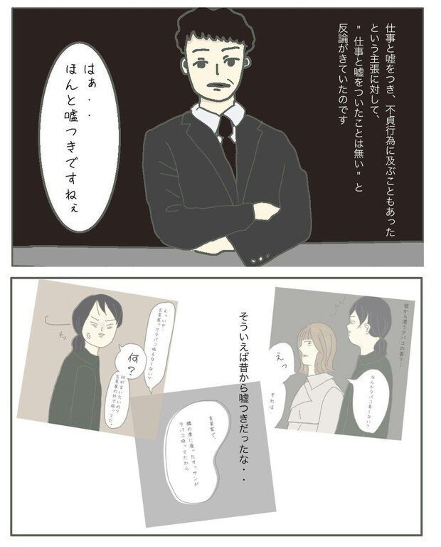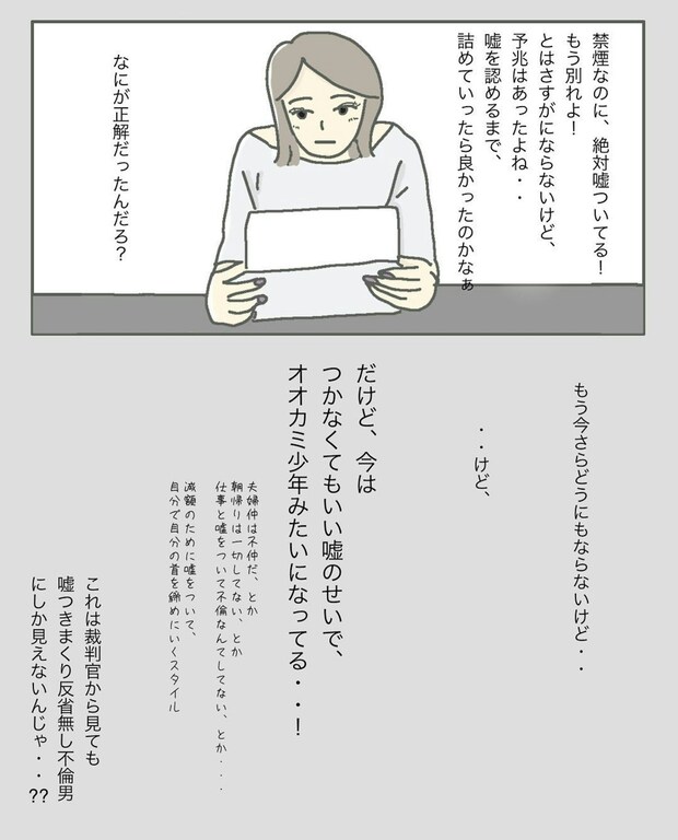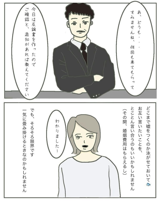 夫の言葉を1つひとつ論破していくまりもさんと弁護士。夫は「どうせバレる嘘」をどうして重ねるのか、まりもさんは理解に苦しんでいます。夫側にもいろいろと言い分はあるのでしょうが、嘘を重ねることで不利になるのは自分。夫側はその辺りをもっと見据えて行動できると良かったのかもしれませんね。