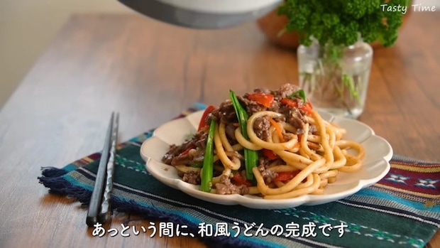 プルコギビーフと野菜、うどんをいっしょに炒め、醬油をひと回しかければ和風うどんの完成!忙しい日でも、これなら簡単に野菜やお肉を食べられますね。