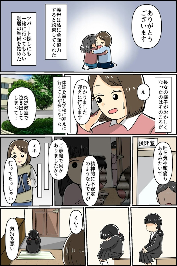 モラハラについて調べ「自分はモラハラを受けていた」とようやく気付いた主人公。義母に相談し家を出ることを決意します。そのころから長女は体調を崩すことが増え、精神的に不安定な様子に。なぜもっと早く家を出なかったのかと、主人公が自分を責める様子に胸が痛むシーンでした。