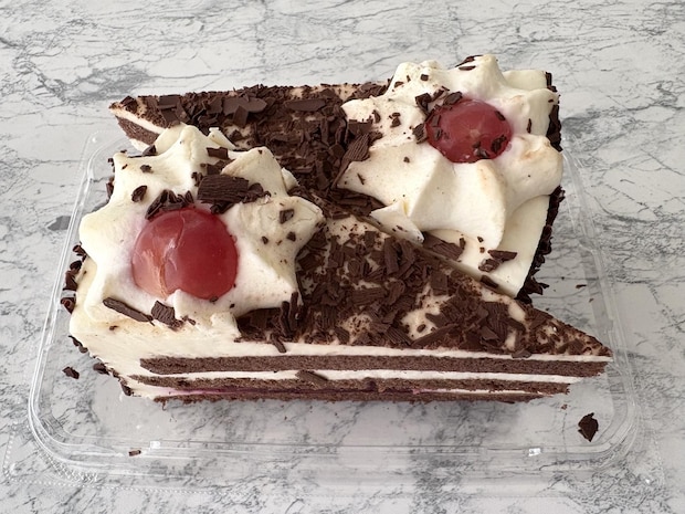惣菜コーナーの一角、定番のチーズケーキやプリンが並ぶ中、見つけたのはホリデーシーズンにもぴったりの「ブレックフォレストケーキ」。
