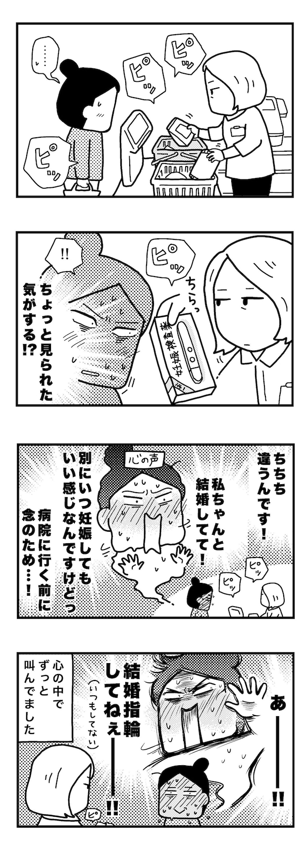 謎の体調不良が続いた和田さん。病院へ行く前に念のため妊娠検査を試してみることにしました。しかしレジでお会計をするとき、店員さんに妊娠検査薬を見られて何かを疑われた気がして……少し恥ずかしくなってしまったのでした。