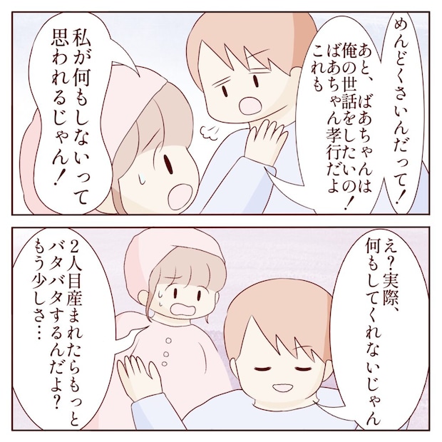 家事も育児もやるべきことはやっているヒナさん。それなのに毎日のように洗濯を義祖母にお願いされては、何もしていないと思われるとリクさんを責めますが、「実際、何もしてくれないじゃん」とリクさんは言い放ちました。ばあちゃんは自分の世話をしたいのだからいろいろ頼むのは「ばあちゃん孝行」だと言いきるリクさんに「2人目が産まれたらもっとバタバタするんだよ?」というヒナさんの言葉はあまり響かないようです。