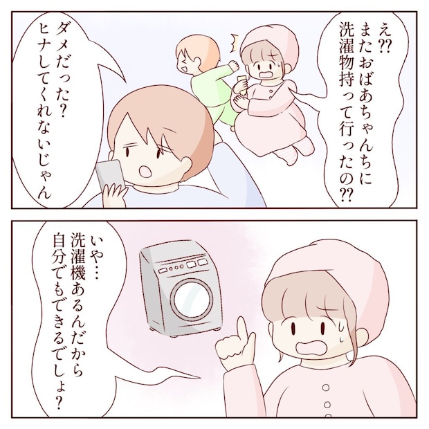 また義祖母に洗濯物を持って行ったことを聞いてヒナさんは少し慌てました。洗濯機があるんだから自分でもできるでしょ?と何度も伝えていますが、リクさんが洗濯機を触ったことなど一度もありません。平然と「ヒナしてくれないじゃん」と、妻のせいにするのでした。