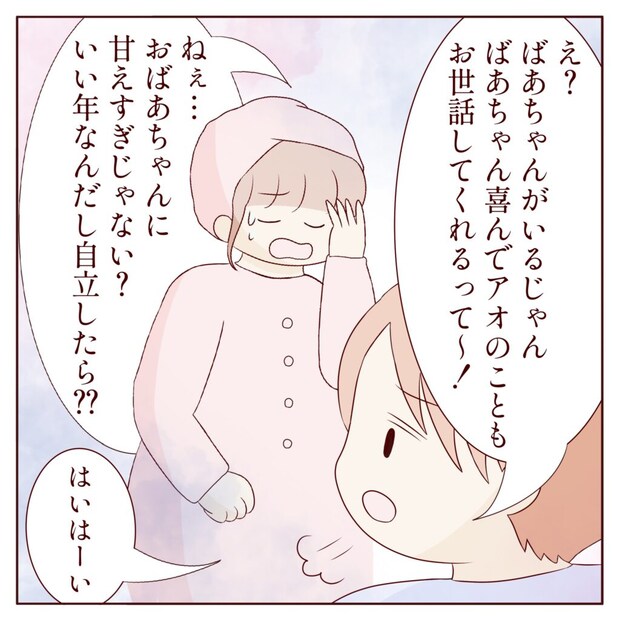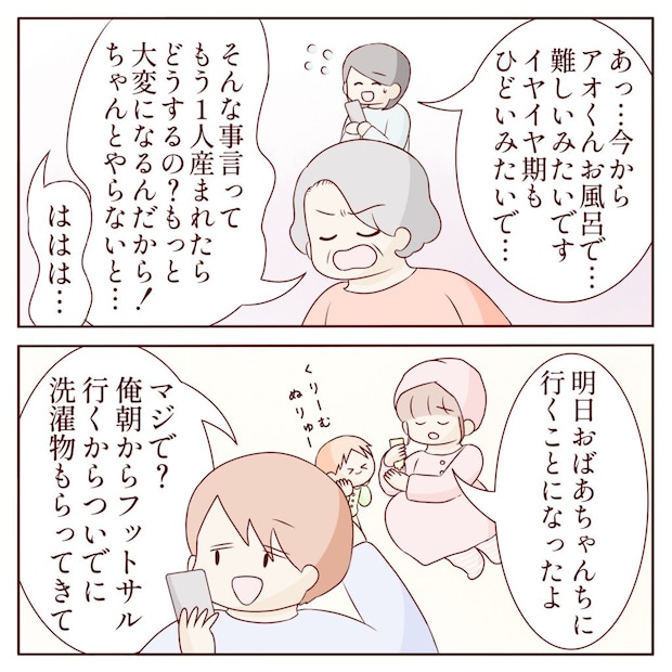 義祖母にヒナちゃんの返事を聞かれ、お風呂も入れなくてはならないし、イヤイヤ期のアオ君がいて大変そうなことを伝えると、義祖母は不満げな顔。リク君にはあんなに甘いのに。2人目が産まれたら「ヒナちゃんが」もっと大変になるのだから、ちゃんとやらないと!と言う義祖母に私は苦笑いしかできませんでした。