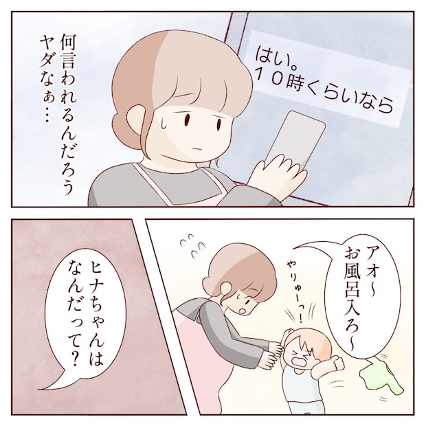 義弟の妻ヒナちゃんをしっかり指導するよう義祖母に言われ、ヒナちゃんに連絡してみましたがアオ君のお風呂を入れるので今日は来られないようです。そりゃそうよね。仕事から帰って、今からアオ君と一緒にお風呂、そしてご飯の準備だってあるもの。