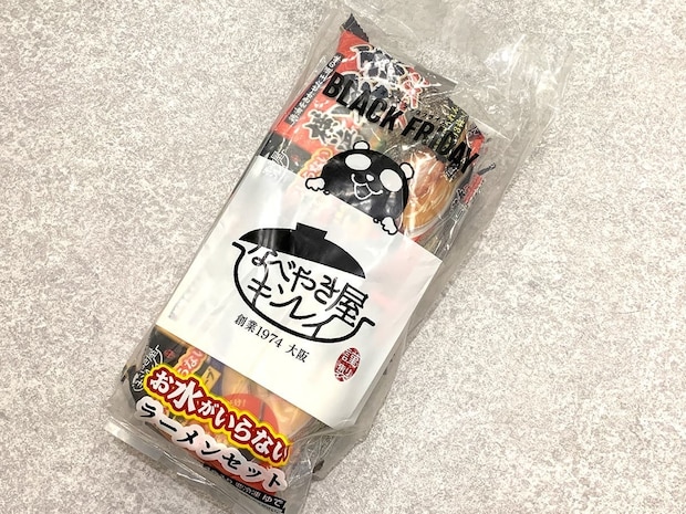 ブラックパンダがひょこっと顔を出すパッケージデザインが目を引く福袋。中にはキンレイの冷凍ラーメンが4種類入っていました。