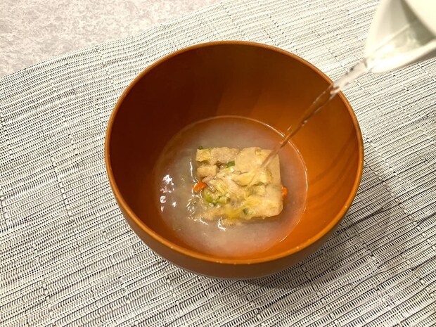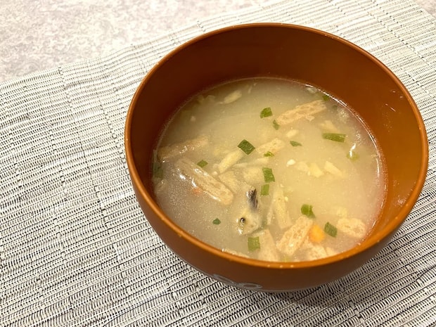 フリーズドライにお湯を注ぎ、出来上がったスープがこちらです。具材としてはオクラ、鶏肉、モロヘイヤ、卵、生姜、わかめ、柚子皮が入っています。