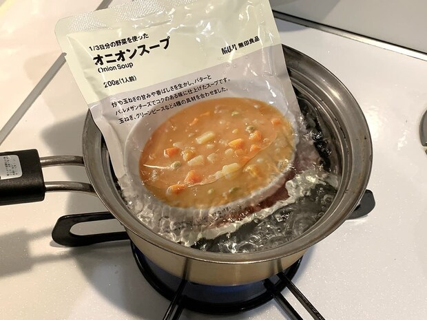 調理方法としては、電子レンジで温めるか湯煎するかのいずれか。少し手間と時間はかかりますが、スープを均一に温めるために湯煎を選択しました。