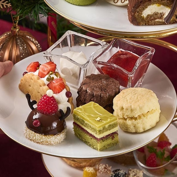 中段には、洋梨ジュレを閉じ込めた愛らしいトナカイムースや、ピスタチオとラズベリージャムが織りなすオペラなど、一つひとつが特別な物語を紡ぐスイーツが用意される。