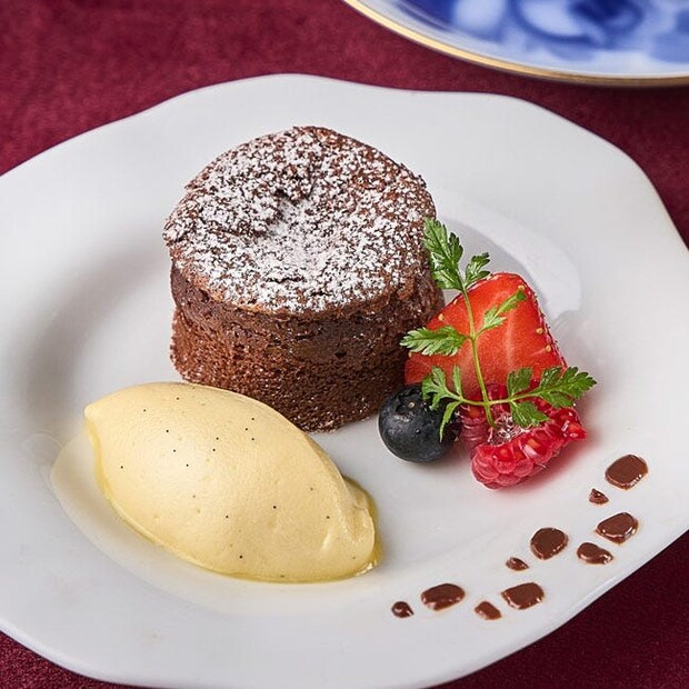 別皿では、温かいフォンダンショコラにバニラアイスとフルーツを添え、チョコレートガナッシュでサンタの足跡が表現された遊び心あふれる1皿を用意。JING TEAの上質な紅茶や日本茶、コーヒーなどお好みのドリンクとともに召し上がれ。