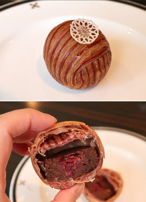 切れ目のないまん丸の形なのに、中にはフランボワーズのコンフィチュールを包んだチョコレートテリーヌがずっしりと入っており、びっくり! なんでも、凍らせたチョコレートテリーヌを包んでから生地を焼いているそうで、シェフの細部へのこだわりが感じられました。そのお味はというと、濃厚なチョコレートの風味の中からキュンと酸味が効いたフランボワーズが現れ、美味。クロワッサン生地の外はパリ、中はしっとりの食感も気に入りました。