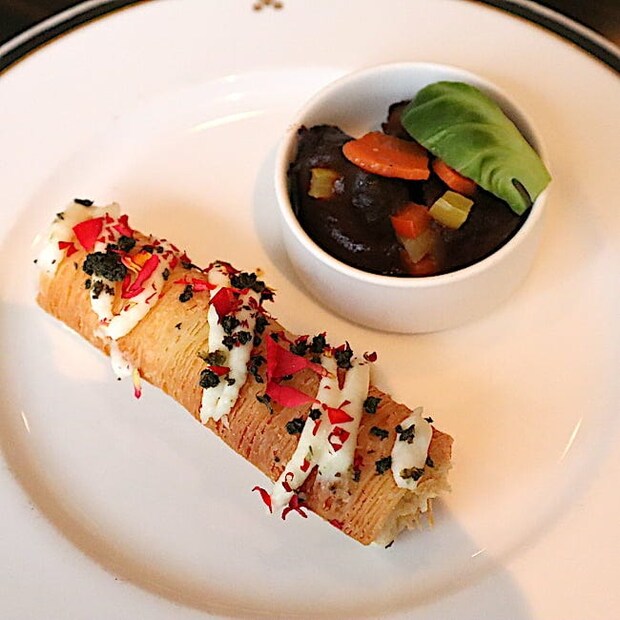 また、「アンチョビポテトのシガレット」は、ブリオッシュ生地によるシガレットにポテトサラダを詰め込んだもの。さっくりとした中から現れるポテトサラダには、アンチョビとガーリックが味わいに力強さを添えており、オプションのシャンパンとの相性も良さそう。