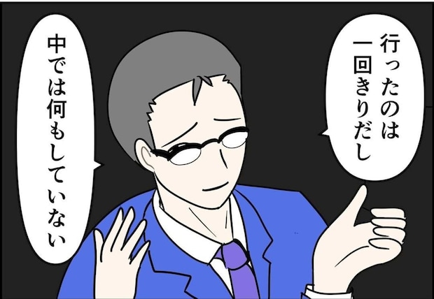 外回り中に女性職員の体調が悪くなり休んだだけだと言い出した邦夫。しかも行ったのは一度だけと言っていますが、嘘をついていることは明白です。しらを切る邦夫に、佳奈さんはどう対応するのでしょうか。