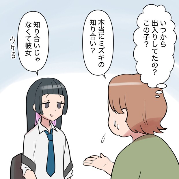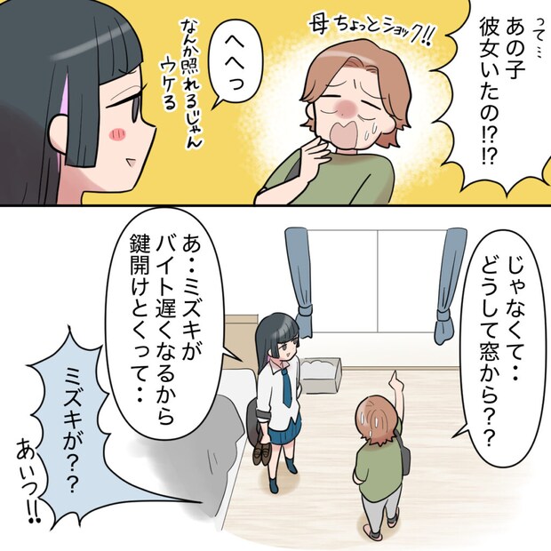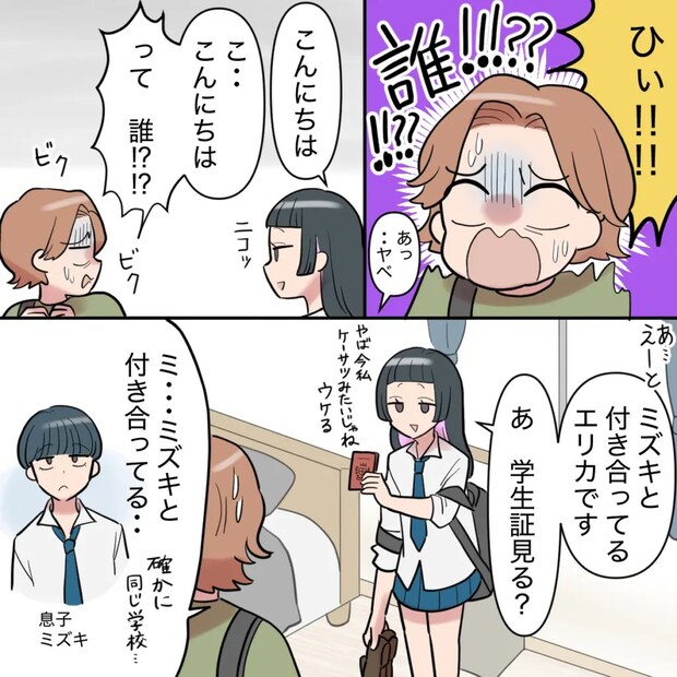 誰もいないはずのミズキ君の部屋に、今まさに窓から入ってこようとしている、制服姿の女子高生エリカちゃんが、ミズキ君の彼女と名乗るのでお母さんは絶句しました。「こんにちは」と笑顔で悪びれない様子や、慣れた感じにお母さんの方が動揺を隠せませんね。