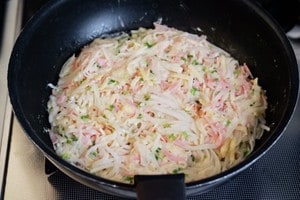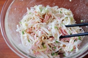 1. 大根はスライサーで細切りにして、めんつゆや片栗粉などと合わせます。細切りのベーコン、小口切りの小ねぎ、ピザ用チーズを加えて全体を混ぜましょう。