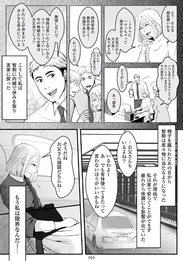 前回、真奈美が小宮課長の歓迎会の幹事を務めると知った智樹は、真奈美に「歓迎会には参加するな」と一方的に言い放つ。怒りが収まらず、ついには椅子を蹴り飛ばすまでに荒れた。それ以来、智樹は物に当たるようになっていき…。