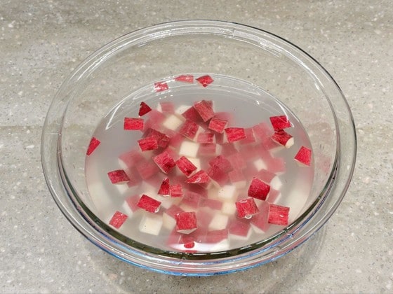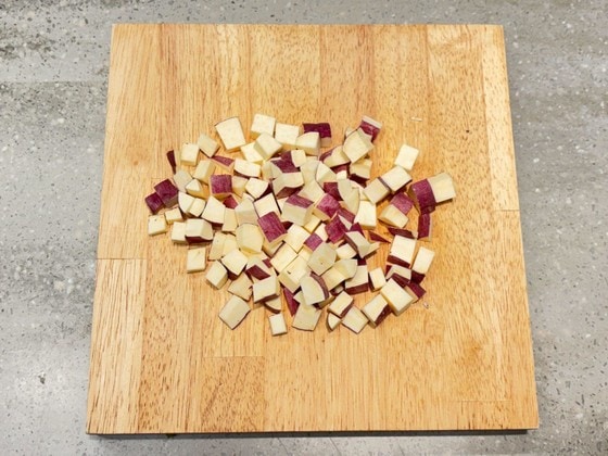 1. さつまいもを皮付きのまま1cm角に切り、5分ほど水にさらします。