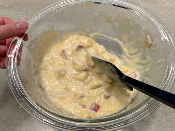 3. ホットケーキ、卵、牛乳、サラダ油、砂糖を混ぜ合わせた生地に2のさつまいもを加え、さらに混ぜます。