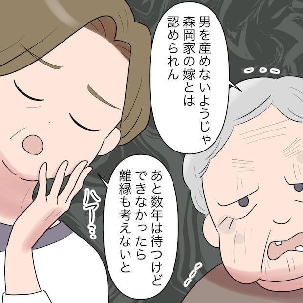 義祖母と義母は身を乗り出し、「男を産めないようじゃ森岡家の嫁とは認められん」「あと数年は待つけど、できなかったら離婚も考えないと」ため息をつきながら、やれやれといった感じで話します。男尊女卑のお手本のような発言に、私は言葉を失いました。