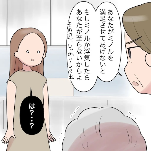 すると隣にいた義母も一緒になって、「あなたがミノルを満足させてあげないと、もしミノルが浮気したらあなたが至らないからよ」と言い放ちました。ため息をつきながら、さも当然のように伝えてくる義母に思考がフリーズします。