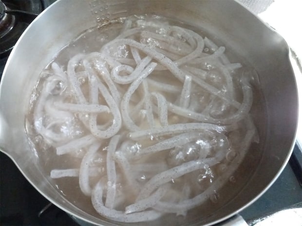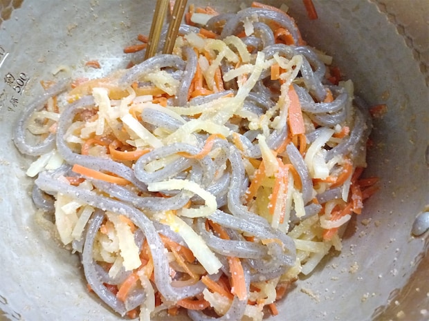 1. にんじんと大根を5cm長さの千切りにして、つきこんにゃくは下茹でする。辛子明太子はほぐしておく。