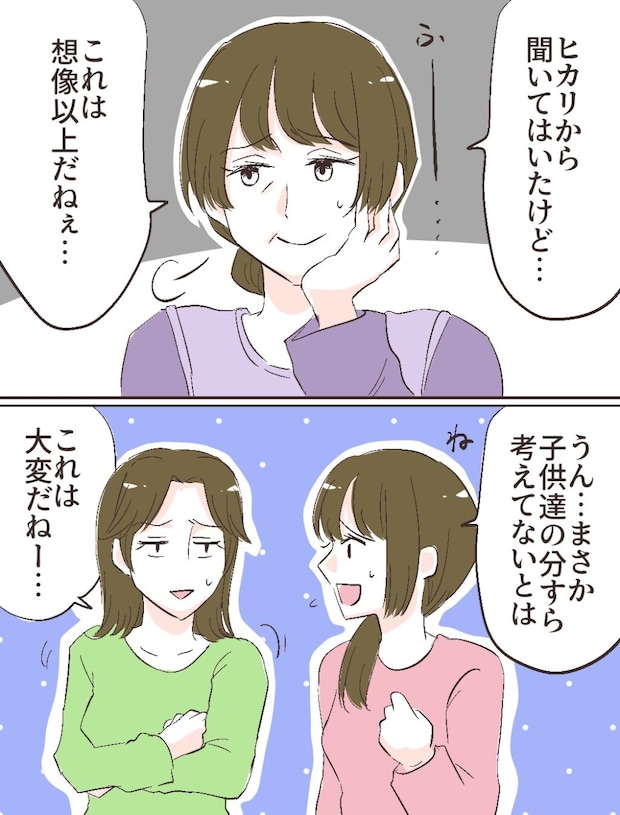 「ヒカリから聞いてはいたけど・・これは想像以上だねぇ・・」と驚きを通り越して呆れ気味の母。「うん・・まさか子ども達の分すら考えてないとは」「これは大変だねー・・」とフトシの食い尽くしにドン引きの姉たち。あぁ・・もう!本当に恥ずかしい!でも、母や姉たちの反応を見て、私の考えがおかしいのではなくやはりフトシがおかしいのだと改めて実感できました。