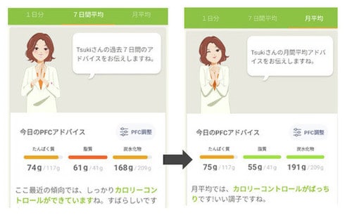 左がダイエット開始時、右が現在のアドバイス画面。オーバーしていた脂質が適正範囲内に