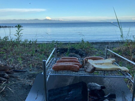 拾っておいた小枝や松ぼっくりを焚火台にくべて火をつけ、夜ごはんの支度を開始する。当初は、粟島で揚がった魚を商店で購入して焼く予定だった。けれど、島の商店で手に入ったのは、ソーセージとエリンギだけ。夢叶わず。