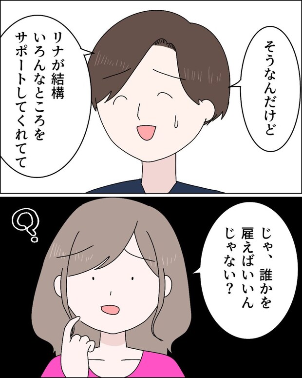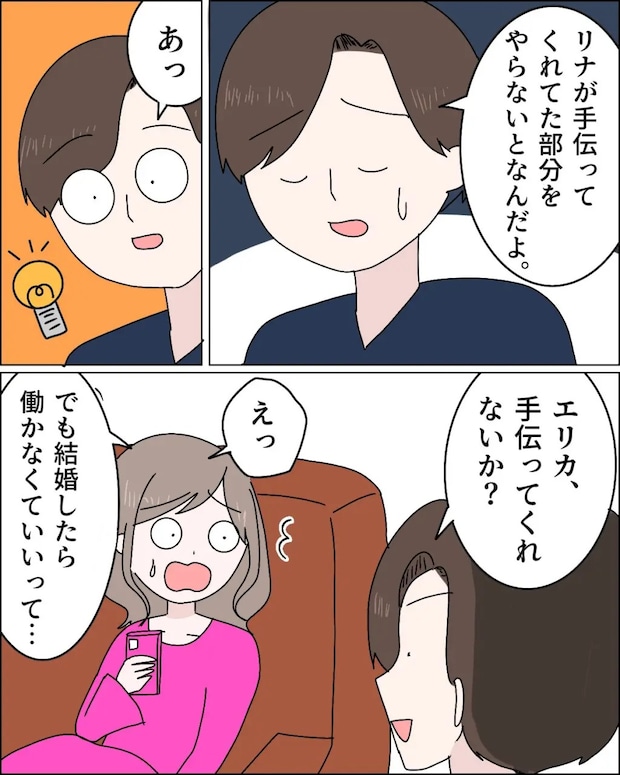「リナが手伝ってくれてた部分をやらないとなんだよ」と言った後、「あっ、エリカ、手伝ってくれないか?」とひらめいたとばかりにエリカさんにそう言うと、「えっ、でも結婚したら働かなくていいって・・」とエリカさんは動揺しました。
